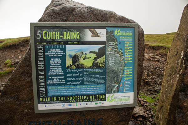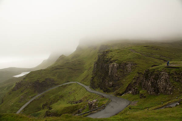 We moved further along the steep and sometimes hair-pin turn road to go visit the Cuith-Raing, or Quiraing, is on a landslip along the eastern side of Meall na Suiramach, northern-most summit of Trotternish Ridge. The geological theatre comprises several landmarks, of which only a few were actually visible due to the low-lying cloud and fog, and due to the heavy wind and rain, we weren’t actually out there long. That said, the views were beautifully dramatic.