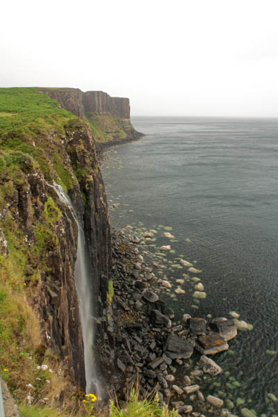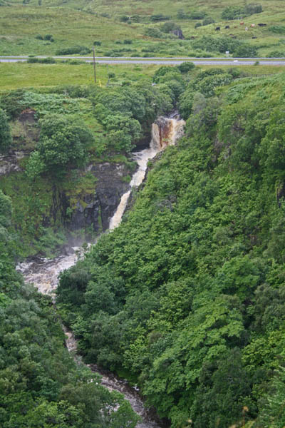 This morning we headed up the Trotternish (northeast) peninsula of Skye along the A855 towards Elishader. As the rain, wind and fog was approaching, the Old Man of Storr was not visible. One of these days, I’ll get to Skye on a sunny day (or at least less overcast) when I can actually see it as the last time I’d been on Skye (May 2006 was the last time). We stopped off at a viewing area in Lealt, near Kilt Rock, where a waterfall dropped heavily due to the increased rain flow. It was also very windy as we made our way over the slight path to take the photos. I had on this ‘waterproof’ camping poncho – not exactly the best thing to wear on the coast of Skye as the wind kept taking the edges and blowing it around like crazy – thus the rains that had started and coming at us somewhat sideways started the soaking of clothing.