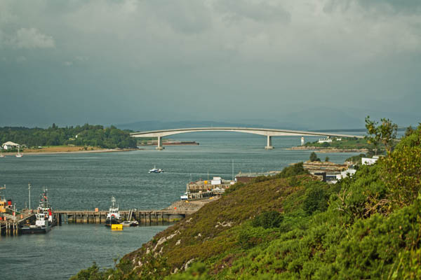The bridge connects over the sound between the villages of Kyle of Lochalsh on the mainland and Kyleakin on the island, and was built from 1992-1995 when it opened. There had been a toll on the bridge of £11.40 (return trips) for a short time before it was cancelled due to heavy protests that it was the most expensive road in Europe and non-payment by residents. In December 2004, the bridge was bought for £27 million and tolls immediately ceased. The image below shows the segment from Eilean Bàn (where there’s a support structure for the bridge between Skye and the mainland.